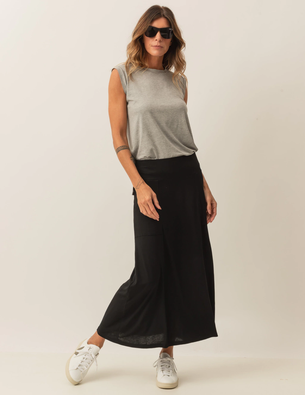 Irresistível de estilo e conforto: a encantadora Blusa Regata em Malha Viscolycra na tonalidade cinza mescla , em perfeita harmonia com a nossa deslumbrante Saia Midi Atenas com elegantes bolsos frontais na cor mostarda.