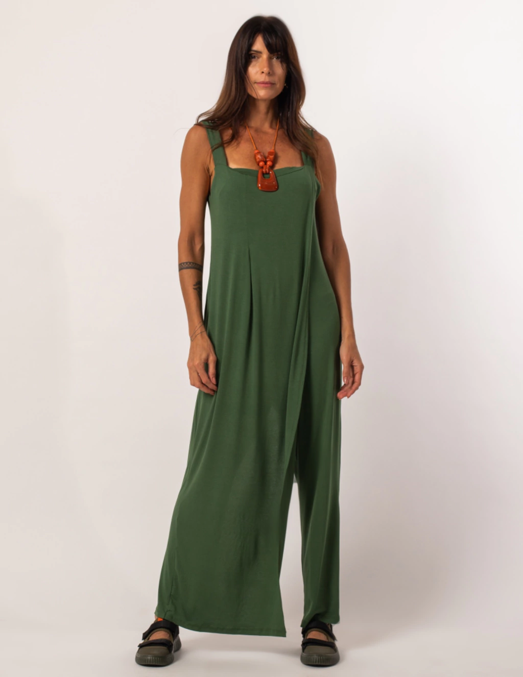 Design Moderno e Sofisticado: O macacão apresenta uma modelagem reta e toda soltinha, oferecendo liberdade de movimentos e uma aparência elegante. Seu detalhe transpassado externo confere um charme extra, criando uma camada adicional de estilo. Além disso, os bolsos na parte de trás adicionam praticidade e um toque despojado ao look.