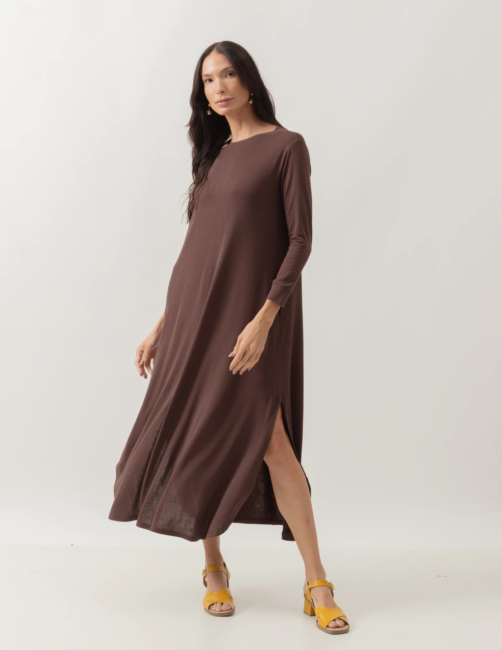 Este vestido em malha viscolycra, com barra arredondada e fendas elegantes, é ideal para ocasiões especiais. As mangas longas e os bolsos discretos adicionam praticidade ao design clássico. Composto por 80% viscose e 20% elastano, ele molda-se ao corpo com leveza e estilo. Seja para um evento ou um passeio casual, o Vestido Longuete Elegance destaca sua beleza com graça.